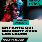 Enfants qui courent avec les loups est un spectacle de théâtre d’objets qui revisite trois contes inspirés de légendes du monde. À travers masques, ombres chinoises et sound design, les deux interprètes de la Compagnie Jizo nous emmènent dans des récits qui parlent de liberté, d’environnement, de différence et d’acceptation de soi.